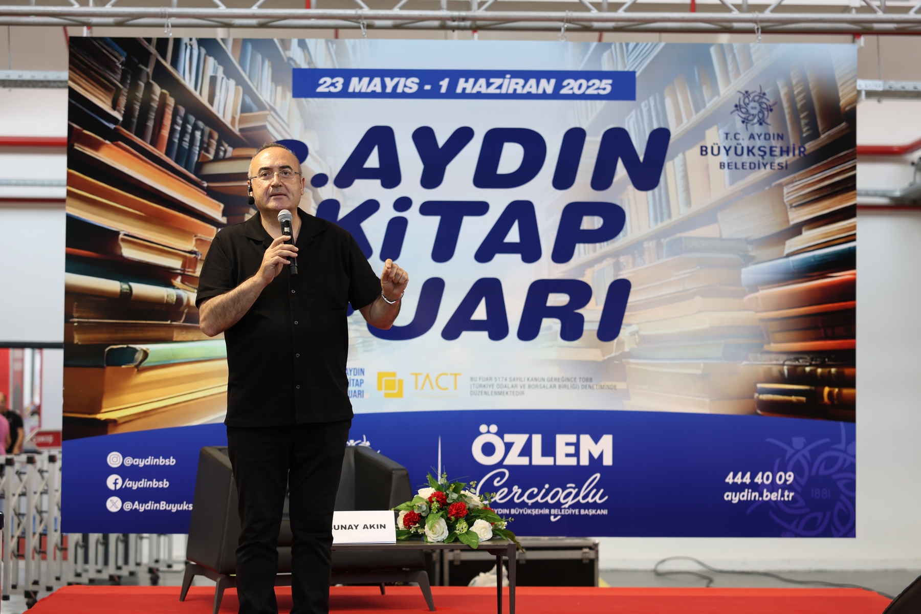 2. Aydın Kitap Fuarı’nın onur konuğu olan Yazar Sunay Akın, ‘İki Kitap Bir Heves’ isimli söyleşisi ve imza etkinliği ile Aydınlı kitapseverler ile buluştu. Akın, Aydın Büyükşehir Belediye Başkanı Özlem Çerçioğlu’na teşekkür ederek fuara katılmaktan ve Aydın’da olmaktan dolayı mutluluk duyduğunu belirtti ve “Dilerim ömrüm yeter de defalarca gelirim Aydın’a. Benim aslında Aydın’a verecek hiçbir şeyim yok çünkü burada çok güzel insanlar yaşıyor. Çok güzel bir orkestra kurmuş başkanımız maestro olarak, kutluyorum kendisini. Kendi başarısı ve buradaki orkestradaki arkadaşların güzelliği. Böyle güzel bir orkestrayı Aydın’a kazandırdığı için çok teşekkür ediyorum kendisine” diye konuştu.