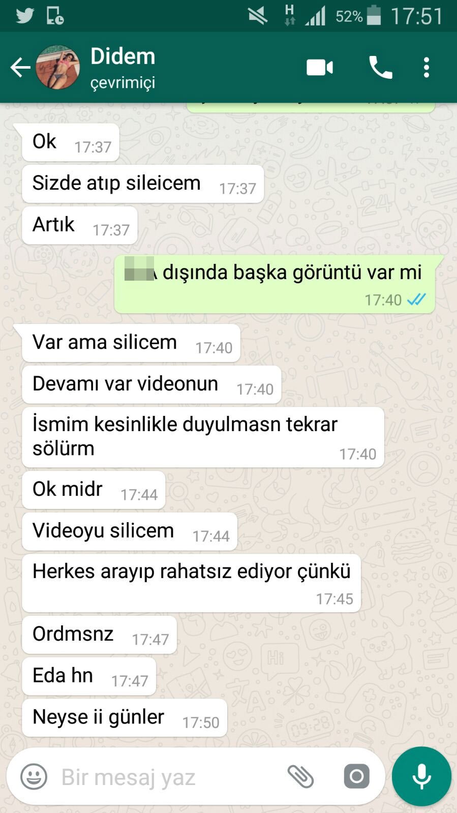 Sözcü WhatsApp İhbar Hattı'nı arayarak görüntüler için para isteyen kişinin Çılgın Dersane 4 adlı filmde oynayan oyuncu Didem Ç. olduğu öğrenildi. Didem Ç., kendisini başka bir numaradan arayan muhabirimizden de önce 2000 TL sonra 1500 TL istedi. (Sözcü)