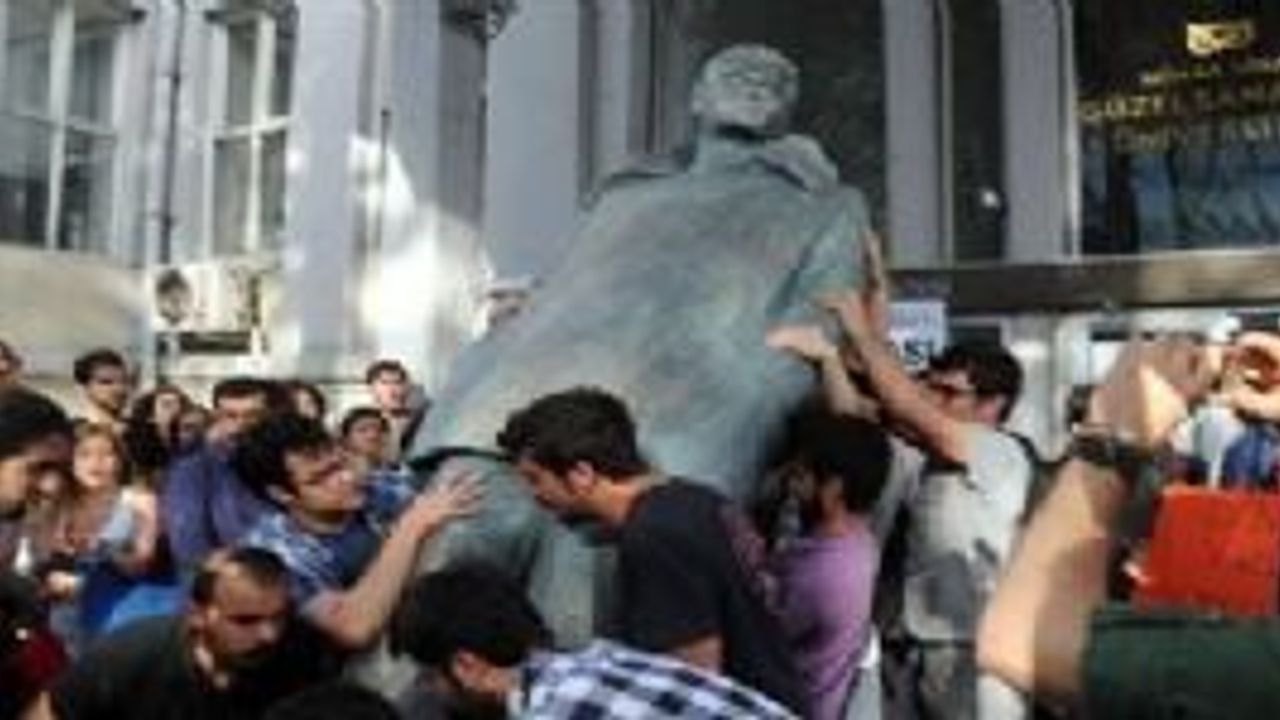 Heykeli tekrar üniversitenin bahçesine dikmek isteyen öğrenciler, dün öğle saatlerinde fakülte önünde toplandı.