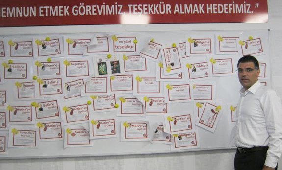 Günün birinde üst düzey yönetici, şirketin verdiği araba ile bir yoldan gidiyor. Birden arabanın yan tarafına taş gelir. Birden taşı atan çocuğu görür. Arabadan inip yanına gider. Çocuk 'tekerlekli sandalyedeki ağabeyim yere düştü, sesimi başka türlü duyuramadım' der. Adam yere düşen diğer çocuğu kaldırır, kanını cebinden çıkardığı mendil ile çözer. O taş bizim pozisyonumuzun, nerede olduğumuzun anlamının olmadığının bir sembolüdür. Biz de bu öyküden esinlenerek çağrı merkezinin bir köşesine koyduk. Müşteriden teşekkür alan insanların ismini bir taşa yazıp kavanoza atıyoruz. Bazen de kavanozdan bir isim çekip o kişiye ödül veriyoruz.