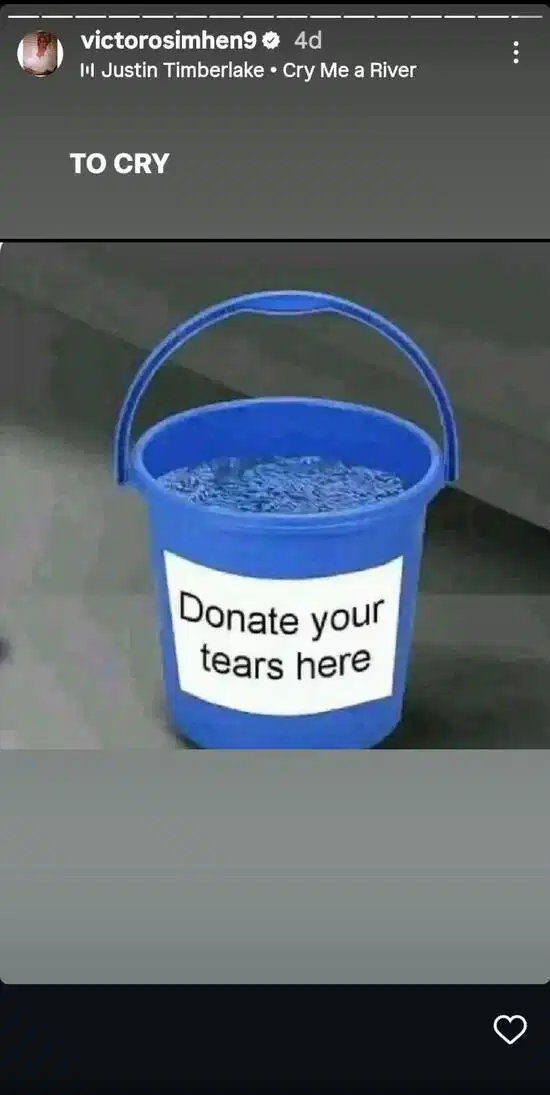 Osimhen, sosyal medya hesabından yaptığı açıklamada, "Gözyaşlarınızı buraya bağışlayın" ifadelerini kullandı.