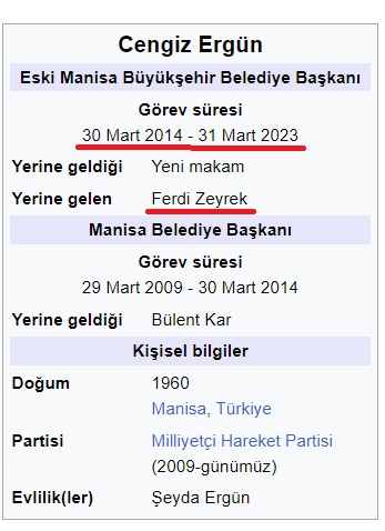 Manisa Büyükşehir Belediye Başkanı Cengiz Ergün'ün Vikipedi sayfasında hala seçimler olmamasına rağmen 'eski' ibaresi yer aldı. Sayfada Ergün'ün görev süresinin 31 Mart 2023'te bittiği ve makamın yerine gelen kişinin CHP Manisa Büyükşehir Belediye Başkan adayı Ferdi Zeyrek olduğu belirtildi.