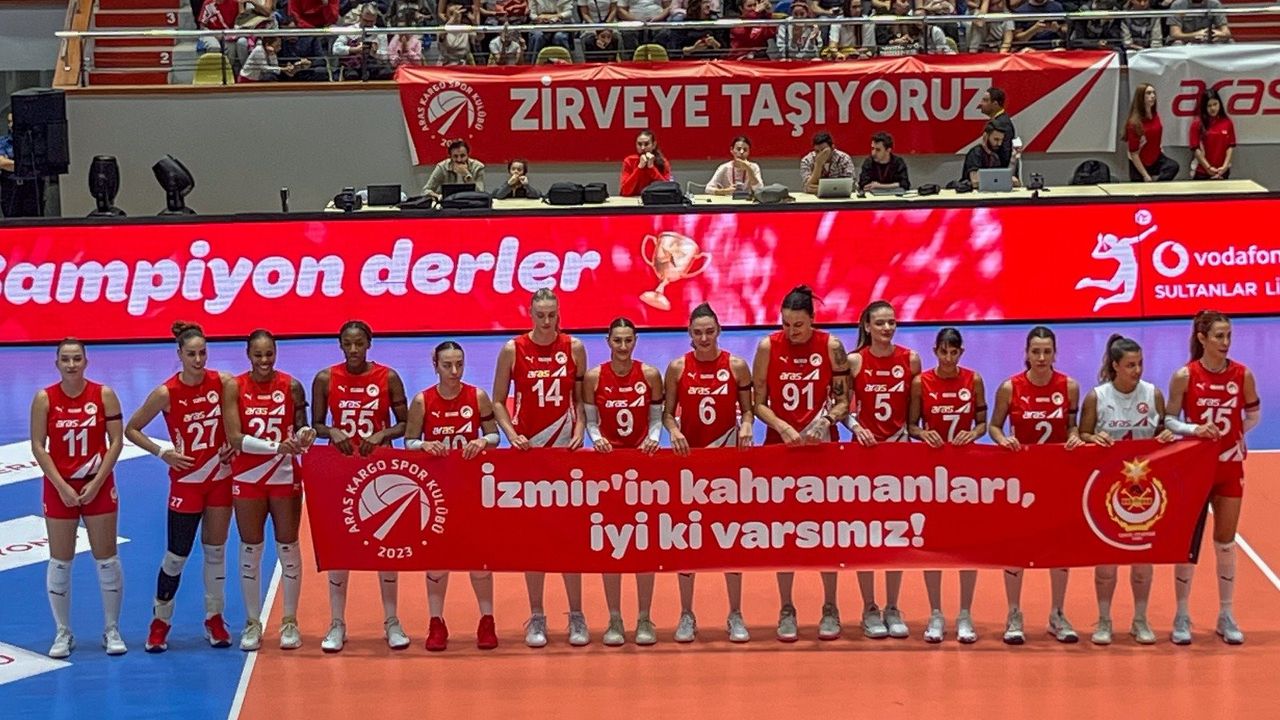 Vodafone Sultanlar Ligi’nde 2025-2026 sezonunun ilk haftası 12 Ekim’de oynanan karşılaşmalarla tamamlandı. Aras Spor Kulübü’nün Fenerbahçe Medicana ile karşı karşıya geldiği mücadele, Alsancak Atatürk Spor Salonu’nda yapıldı. Karşılaşma öncesinde Aras Spor Kulübü, yaz aylarında meydana gelen orman yangınlarında gösterdikleri özverili çalışmalar nedeniyle İzmir Büyükşehir Belediyesi İtfaiye Dairesi Başkanlığı’na anlamlı bir jestte bulundu. İtfaiye Dairesi Başkanı Yaşar Korkmaz ve beraberindeki itfaiye personeli, alkışlar eşliğinde sahaya davet edilerek plaketle onurlandırıldı. Plaketi, Aras Kargo Genel Müdürü ve Yönetim Kurulu Üyesi Utku Ayyarkın takdim etti. Ayrıca İtfaiye Dairesi Başkanı Yaşar Korkmaz, Türkiye A Milli Kadın Voleybol Takımı ve Fenerbahçe kaptanı Eda Erdem Dündar ile Aras Spor Kulübü kaptanı Hazal Selin Uygur’a İzmir İtfaiyesi’nin flamasını takdim ederek, iki takıma da başarılı bir sezon geçirmeleri temennisinde bulundu.
