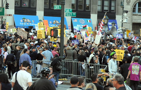 New York'ta üçüncü haftasına giren ve kentin ünlü finans caddesi Wall Street çevresinde yoğunlaşan protesto gösteri ve yürüyüşleri, 'Wall Street baskını'ndan önce de sürdü. Aralarında öğretmenler, avukatlar, maden isçileri, ulaşım isçileri, hemşireler, doktorlar gibi değişik meslek gruplarını temsil eden sendikalar, meslek birlikleri ile öğrencilerin de destek verdiği gösterilerin ardından düzenlenen yürüyüşlerde, 'Halkı satıp bankaları kurtardılar', 'Savaşlara son verin, zenginleri vergilendirin' diye sloganlar atan binlerce kisi, Amerikalıların yüzde 99'unun çıkarlarını yüzde 1'lik azınlığa karşı koruduklarını belirterek bu görüşü savunan pankartlar taşıdı. Protestocular, daha sonra kapitalist sistem, işsizlik, ekonomik ve toplumsal eşitsizlik gibi sorunlara tepkiler içeren konuşmaların yapıldığı, New York Belediye Binası yakınlarındaki Foley Park'ta toplandı. ABD'nin ekonomik, sosyal, eğitim ve sağlık siteminde köklü değişiklikler isteyen protestocular, Wall Street'i işgal edinceye kadar eylemlerini sürdüreceklerini belirtti.(DHA)