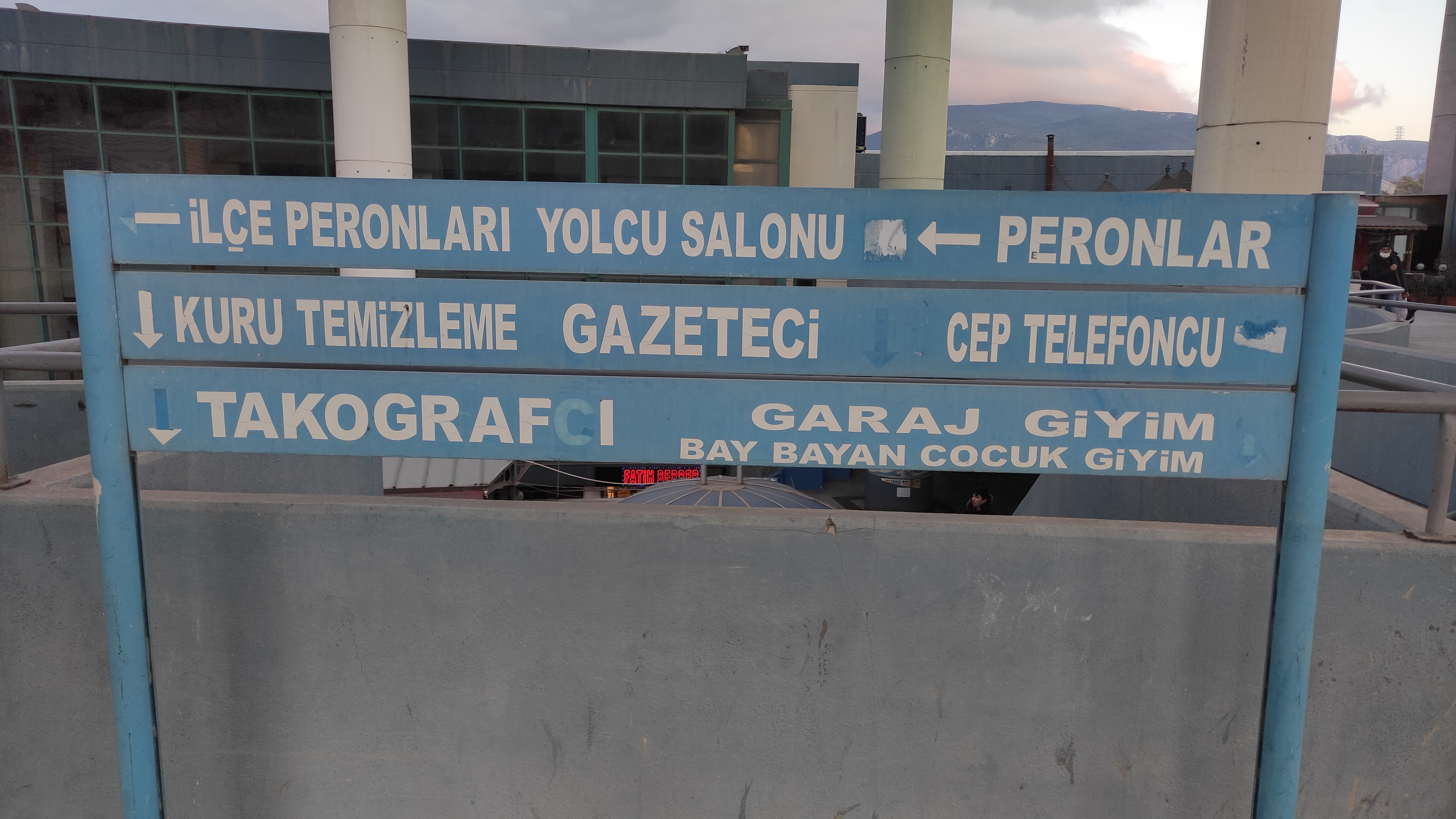 Otogarın mavi bilgi tabelaları ise zamana karşı direniyor. Bazı harfleri sökülmüş olan yön tabelalarının otogara girenin zaman algısının kaybolmasına yol açabiliyor.