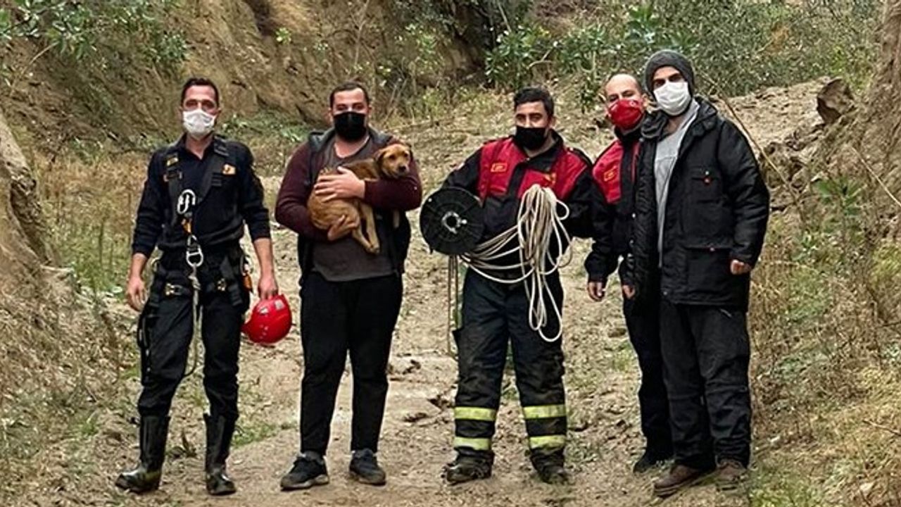 Yağmurdan ve soğuk havadan korunmak için kendine oyuk yaparak bekleyen köpeği, itfaiye ekibi halat yardımıyla yamaçtan inerek mahsur kaldığı bölgeden kurtardı.