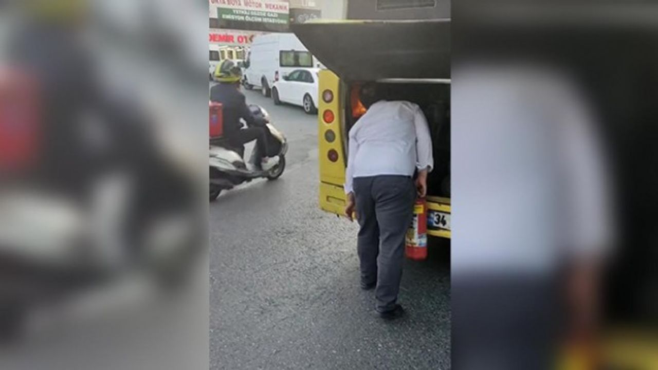 Olayı gören vatandaşlar, 'Tüpü sık, üflemeyle sönmez' şeklinde uyarıda bulunurken, otobüs şoförü elindeki yangın tüpünü sıkarak yangını söndürdü.