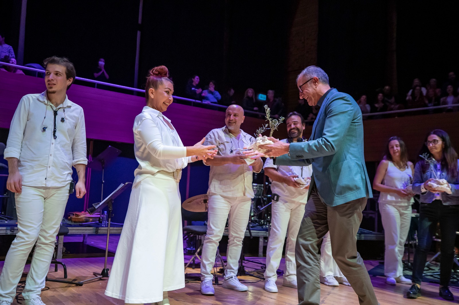 Ardından İzmir Büyükşehir Belediyesi Genel Sekreter Yardımcısı Ertuğrul Tugay ve Yaşar Kemal'in eşi ve Yaşar Kemal Vakfı Başkanı Ayşe Semiha Baban Gökçeli grup üyelerine barışın simgesi zeytin fidanlarını armağan etti.