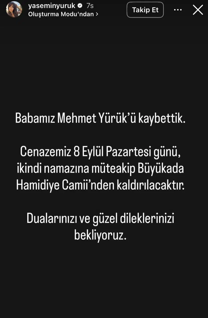 “Babamız Mehmet Yürük'ü kaybettik. Cenazemiz 8 Eylül Pazartesi günü, ikindi namazına müteakip Büyükada Hamidiye Camii’nden kaldırılacaktır. Dualarınızı ve güzel dileklerinizi bekliyoruz.”