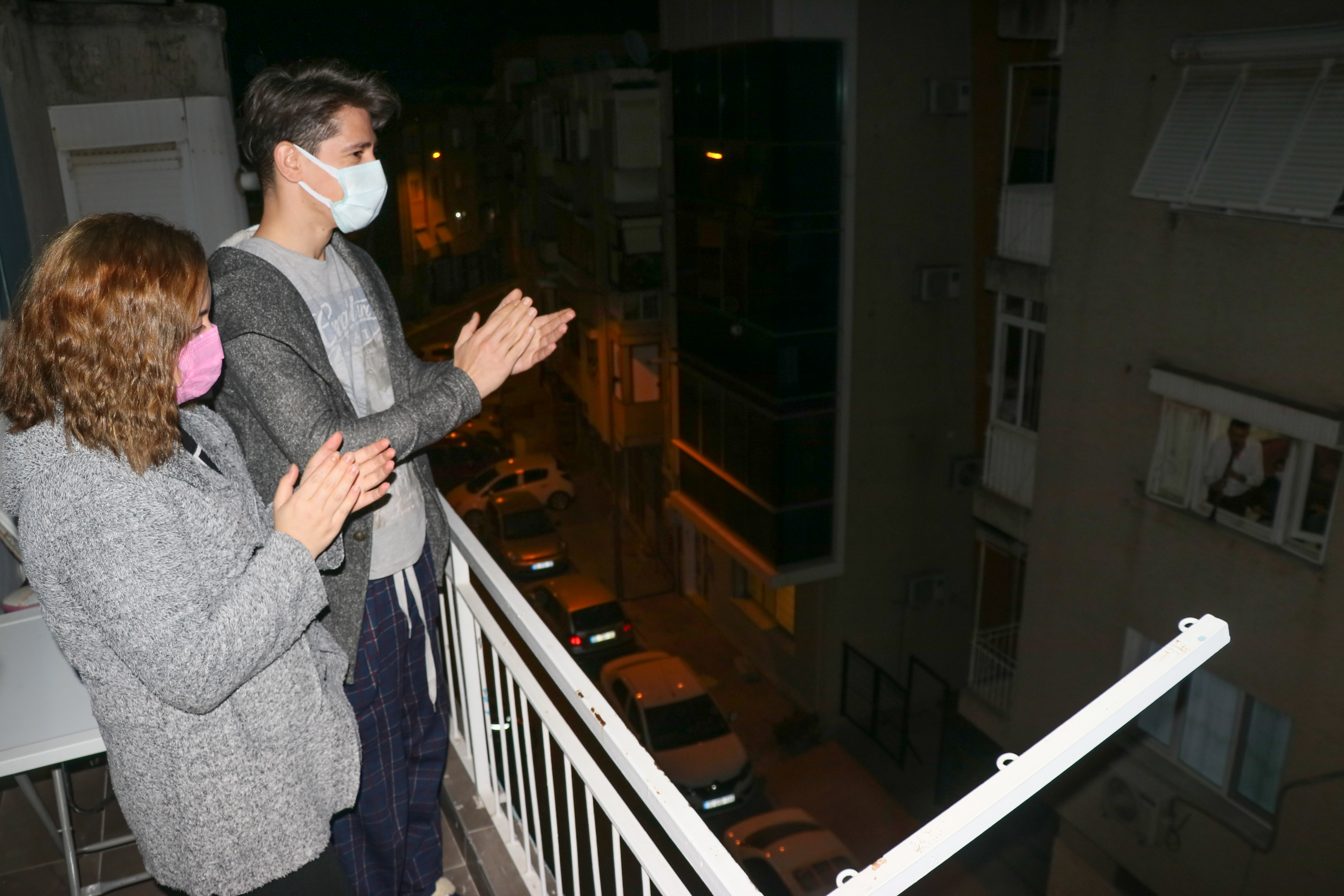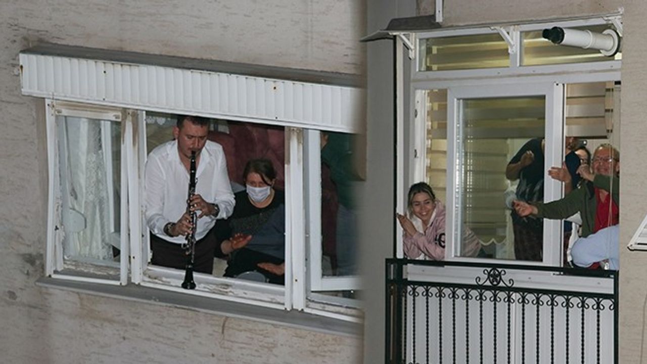 Sokağa çıkma kısıtlamasının başladığı saatlerde enstrümanlarıyla evlerinin balkonuna çıkan Barış Özkaya ve annesi, mahalle sakinlerine bir saat boyunca konser veriyor.