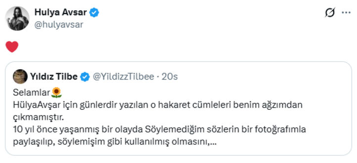 Hülya Avşar da Yıldız Tilbe'nin bu paylaşımını kalp emojisi ile paylaşarak iddiaları yalanladı.