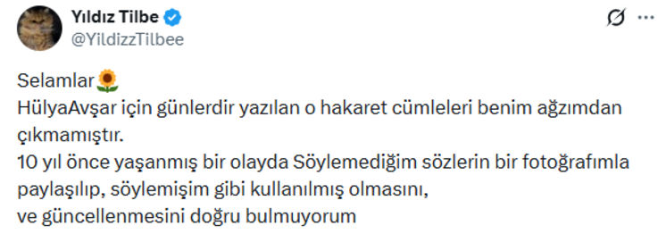 İddiaların gerçeği yansıtmadığını ifade eden Yıldız Tilbe; "Selamlar, Hülya Avşar için günlerdir yazılan o hakaret cümleleri benim ağzımdan çıkmamıştır. 10 yıl önce yaşanmış bir olayda söylemediğim sözlerin bir fotoğrafımla birlikte paylaşılıp, söylemişim gibi kullanılması ve güncellenmesini doğru bulmuyorum" dedi.
