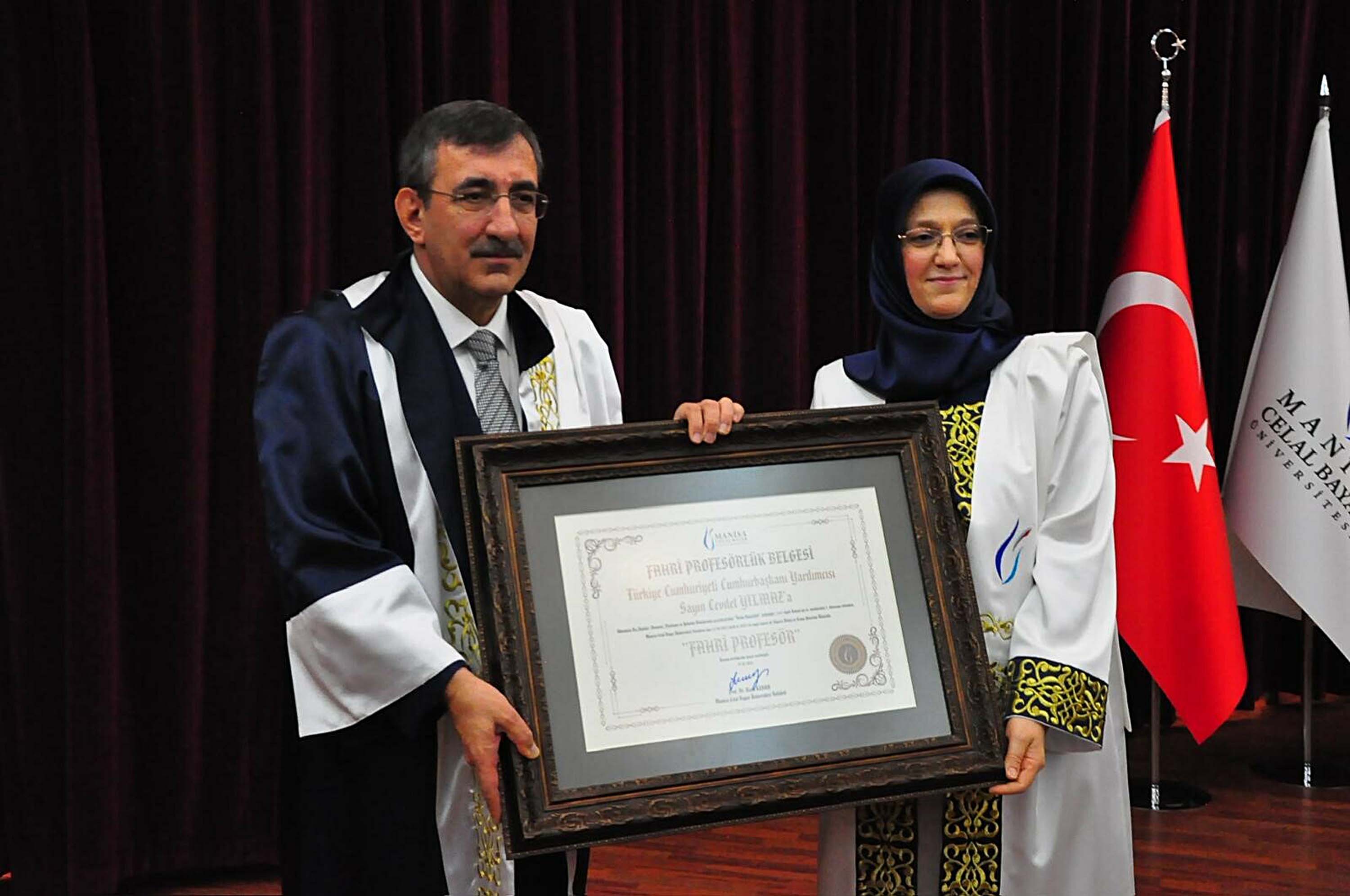 Cumhurbaşkanı Yardımcısı Cevdet Yılmaz, Manisa Celal Bayar Üniversitesi 2025-2026 Akademik Yılı Açılış Töreni’ne katıldı. Törene; Cumhurbaşkanlığı Genel Sekreteri Hakkı Susmaz, Manisa Valisi Vahdettin Özkan, TBMM AK Parti Grup Başkanvekili ve Manisa Milletvekili Bahadır Yenişehirlioğlu, AK Parti Manisa Milletvekilleri Murat Baybatur, Ahmet Mücahit Arınç, Tamer Akkal, Manisa Büyükşehir Belediye Başkanı Besim Dutlulu, AK Parti Manisa İl Başkanı Süleyman Turgut, MHP Manisa İl Başkanı Cüneyt Tosuner, Manisa Celal Bayar Üniversitesi Rektörü Prof. Dr. Rana Kibar, akademisyenler ve öğrenciler katıldı. Törende Cumhurbaşkanı Cevdet Yılmaz'a üniversite senatosunun aldığı kararla Siyaset Bilimi ve Kamu Yönetimi alanında fahri profesörlük ünvanı verildi.