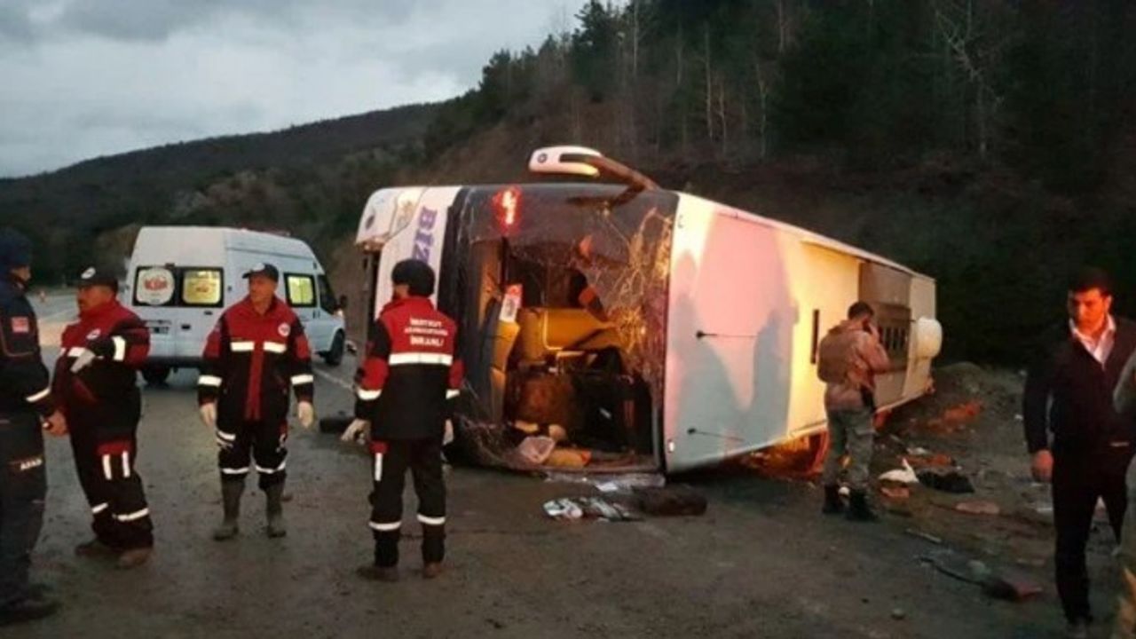 Yol kenarına devrilen otobüsteki 22 kişi yaralandı.