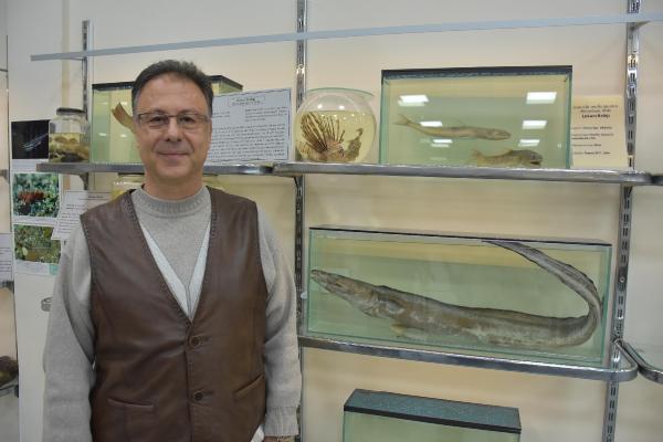 Türkiye'de sergilenen kılıç dişli yılan balığı hakkında bilgi veren Prof. Dr. Tanrıkul, 'Bu tür Ekim 2020'de getirildi. Antalya kıyılarında bir balıkçı tarafından avlanılarak müzemize hediye edildi. Kızıldeniz'den Akdeniz'e gelen bir tür. Üniversitemiz bünyesinde bu türün bilimsel çalışmaları yapıldı. Bu balığın aslı Pasifik Okyanusu'nda bulunuyor. Daha sonra Kızıldeniz'e yerleşmiş. Bu balık sık karşılaşılan bir tür değil. Bu balığın aslı sadece bizim fakültemizdeki merkezde sergileniyor. Bu tür, müren ve kongar yılan balığı arasında bulunan bir canlı. Şimdiye kadar birkaç tane çıkmış. Bir tanesi de bizim merkezimizde sergileniyor. Bu balığın kongar gibi ince ve kaygan bir derisi, müren balığı gibi dişleri bulunuyor. Bu yüzden bu balığa bir ara tür olarak bakıyoruz. Ülkemizde yalnızca üniversitemizde sergileniyor ve bu tür eğitim amaçlı tanıtılıyor' ifadelerini kullandı.