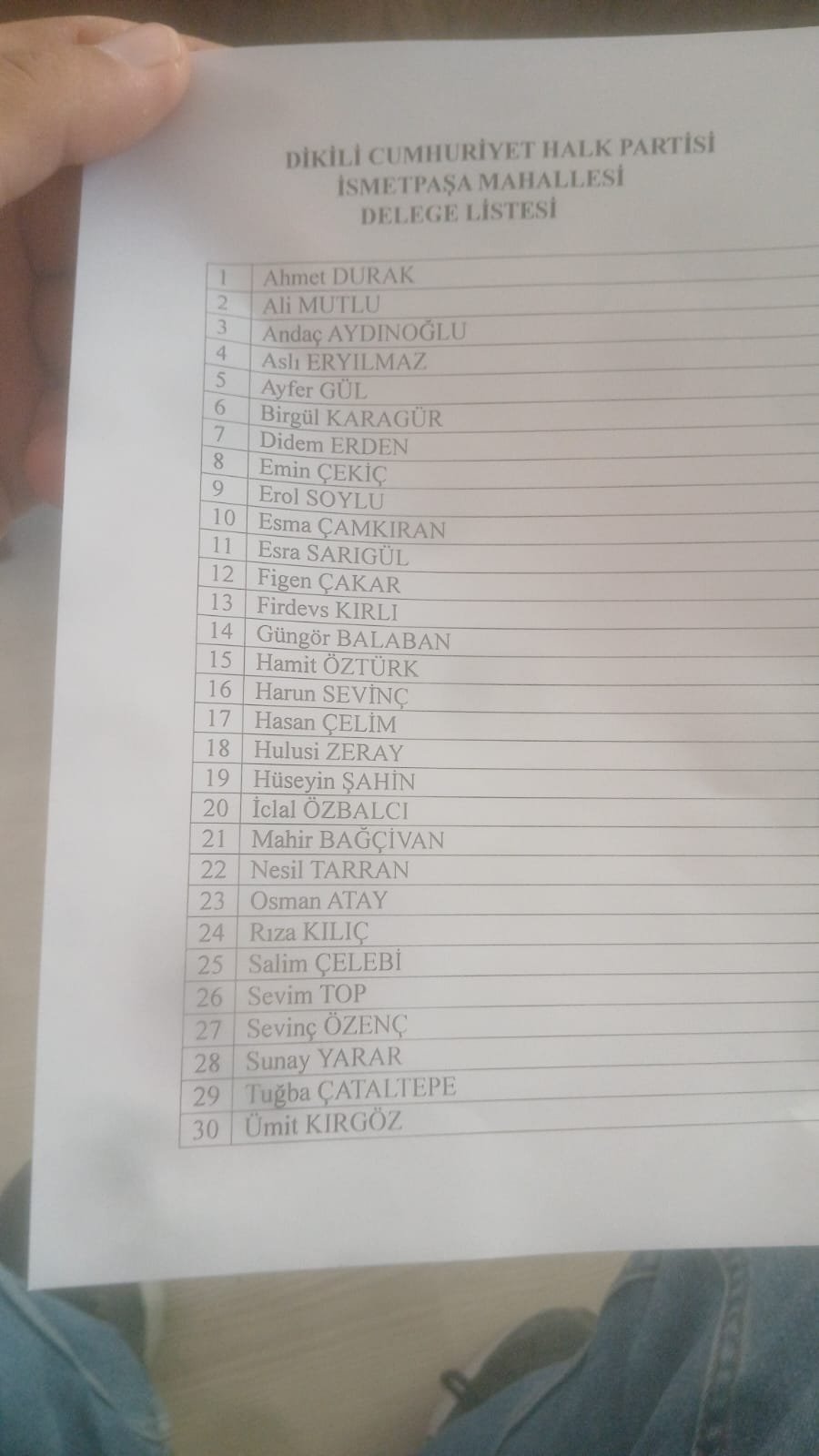 Dikili'de Çağlan, İsmetpaşa, Kıroba, Kocaoba, Mazılı, Samanlıköy, Yenice mahallelerinde üyeler sandığa gitti. Dikili Belediye Başkanı Adil Kırgöz'ün oğlu Ümit Kırgöz İsmetpaşa mahallesinde listeye girdi. Tek liste olan İsmetpaşa mahallesinde 30 delege seçildi.