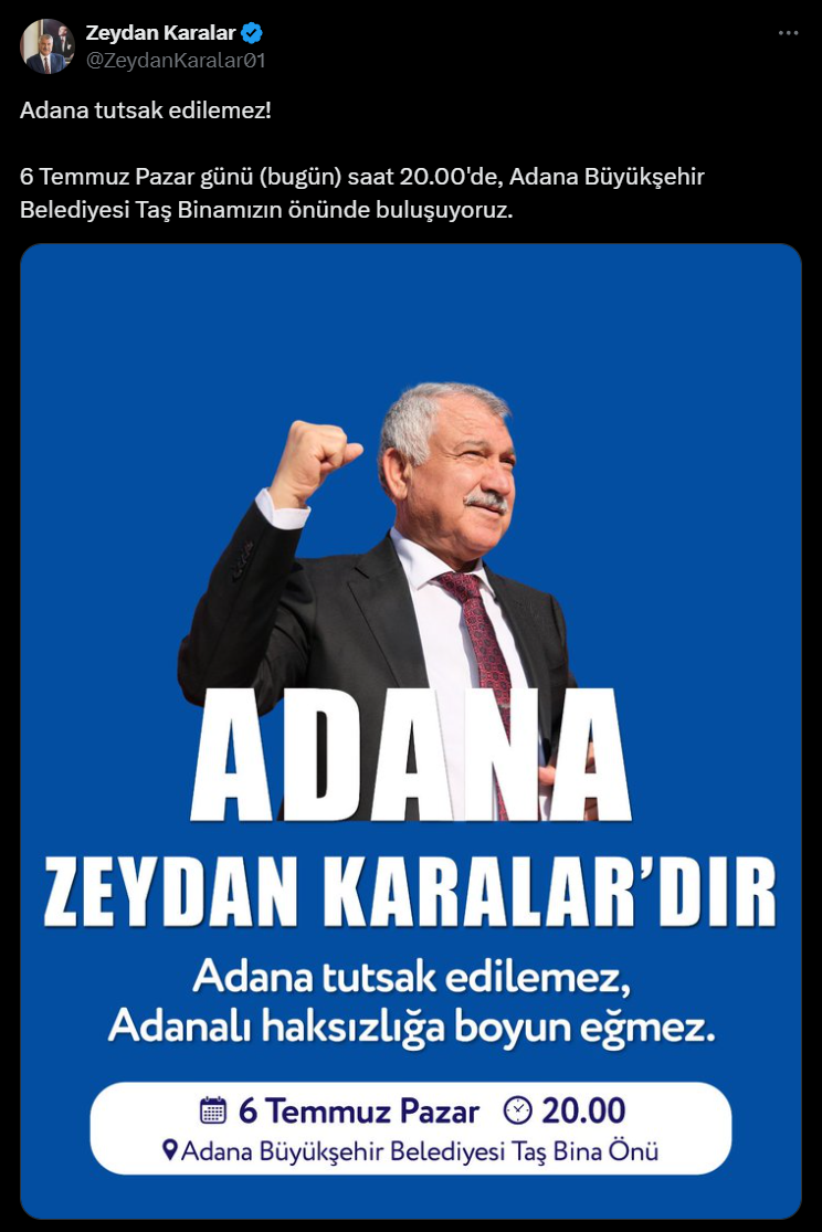6 Temmuz Pazar günü (bugün) saat 20.00'de, Adana Büyükşehir Belediyesi Taş Binamızın önünde buluşuyoruz.”