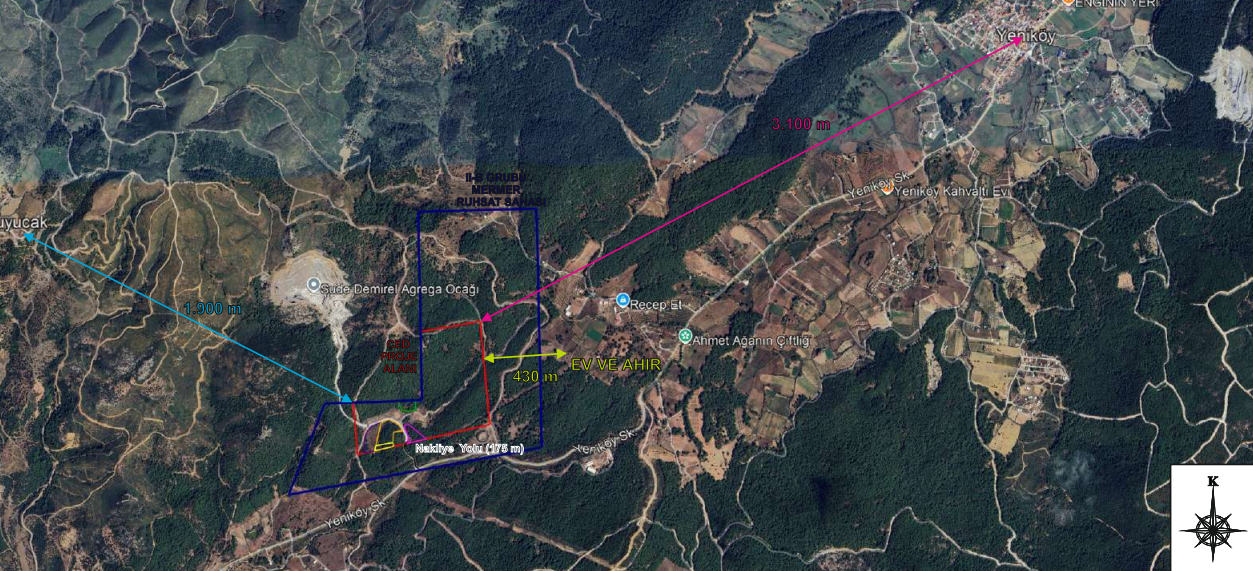 Proje sahası, Kuyucak’a 1,9 kilometre, Yeniköy’e ise 3,1 kilometre mesafede bulunuyor. Ayrıca ocak alanının hemen yanında zeytinlikler yer alıyor. ÇED dosyasında, proje sahasında da yaklaşık 0,9 hektarlık zeytinlik alan bulunduğu belirtiliyor.