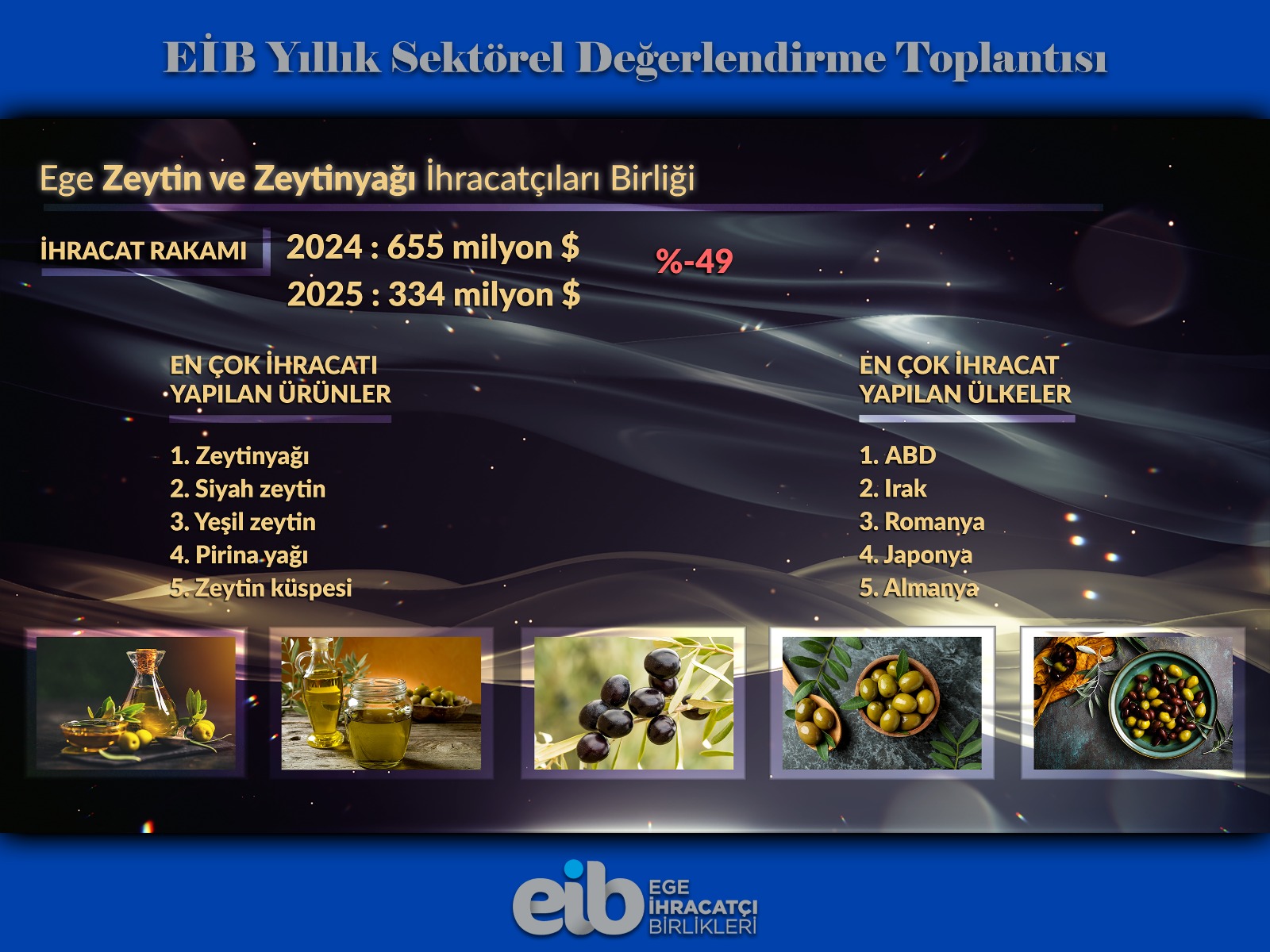 EİB Zeytin ve Zeytinyağı İhracatçıları Birliği Başkanı Mehmet Emre Uygun, sektörüne dair değerlendirmelerde bulundu. Uygun, sektörün ihracat rakamlarındaki çarpıcı tabloyu anlattı. Tabloya göre zeytin ve zeytinyağı sektöründe ihracat bir yılda yüzde 50 seviyesinde düşüş yaşadı.