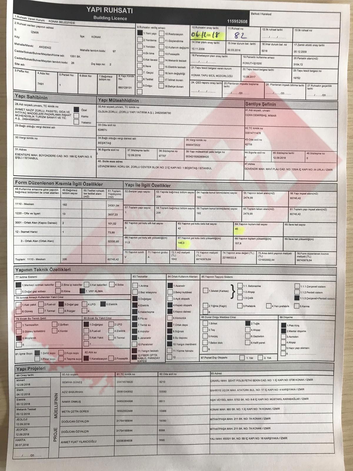 Konak Belediyesi'nin önceki Başkanı Sema Pekdaş döneminde verilen yapı ruhsatının evrak tarihinde 06.12.2018 yazıyor. Ruhsat Müdürlüğü'nün 82 numaralı ruhsatı olarak kayıtlara geçen yapı ruhsatında yapının sahibi olarak da 'Ahmet Nazif Zorlu-Passtel Gıda ve İhtiyaç Maddeleri Pazarlama İnşaat Mühendislik Turizm Sanayi Tic. AŞ.' ifadesi yer alıyor. Yapı Müteahhidinin Olgun Zorlu (Zorlu Yatırım A.Ş) olarak belirtildiği ruhsatta yapının yol kotu üstü yüksekliği ise 146,3 metre olarak belirtiliyor. Toplam kat sayısı ise 45 olarak görünüyor.